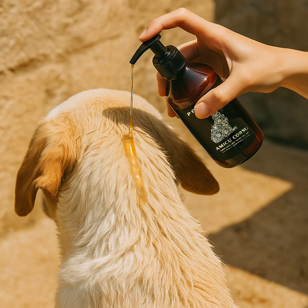 Our formulations are plant-based, gentle, and infused with botanicals chosen for both their efficacy and purity. Handcrafted in small batches in France, our dog shampoos and conditioners blend the essence of Corsican nature, ethically sourced essential oils, and timeless French elegance.